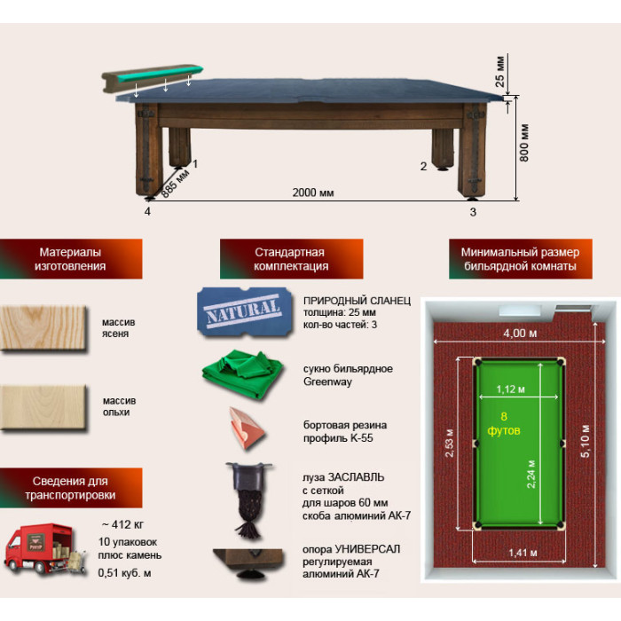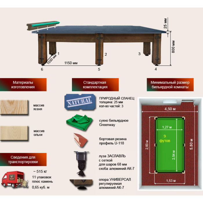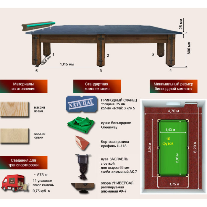- Натуральный сланец в основании игрового поля и качественное сукно обеспечивают отличный раскат шаров.
