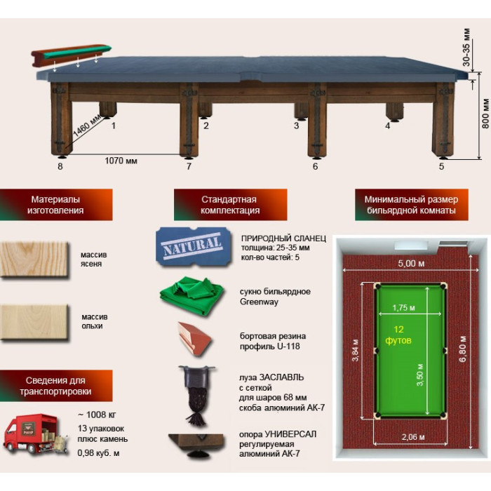 Стол для русского бильярда Камелот 7-12 футов камень 25-35мм