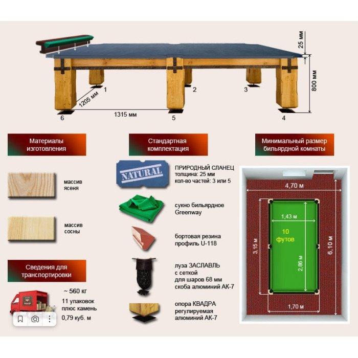 - Натуральный сланец в основании игрового поля и качественное сукно обеспечивают отличный раскат шаров.