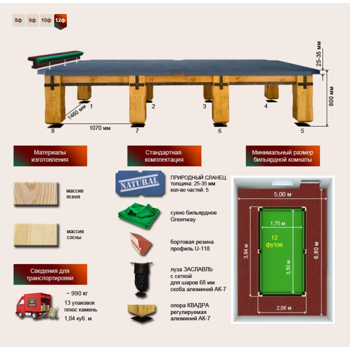 Стол для русского бильярда Витязь 7-12 футов камень 25-35мм
